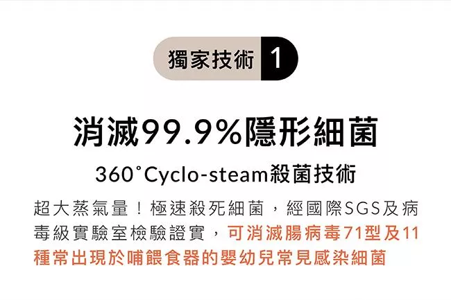 •360˚Cyclo-steam殺菌技術,消滅99.9%隱形細菌。