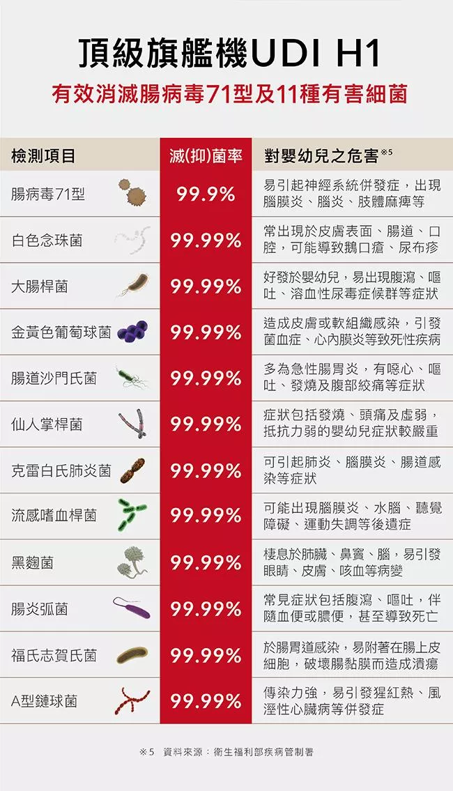•經病毒級實驗室、SGS UTIS實驗室證實,有效殺死腸病毒71型及11種有害細菌。
