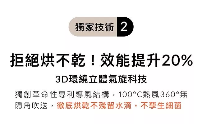 •獨家3D環繞立體氣旋科技,烘乾效能提升20%,徹底烘乾不殘留水滴。