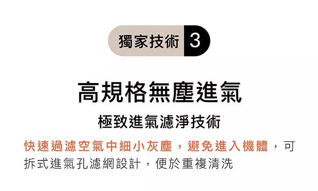•極致進氣濾淨技術,過濾空氣中細小灰塵,避免進入機體,可拆式進氣孔濾網方便清洗。