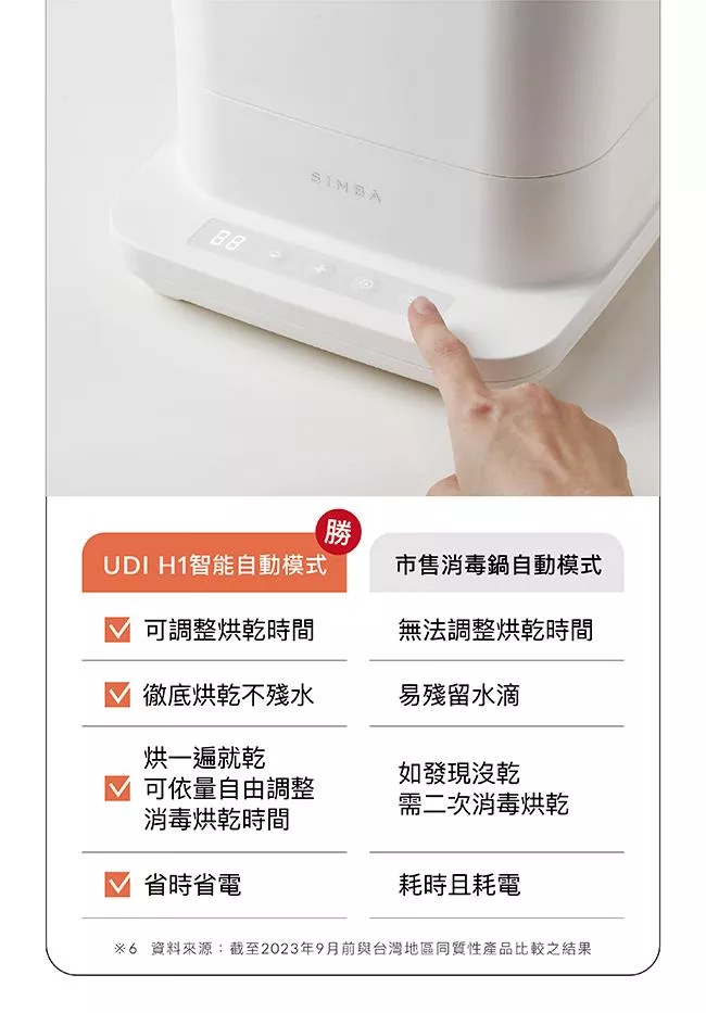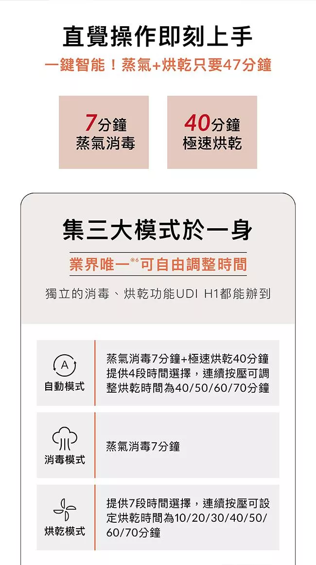 •三大智能模式:自動模式、烘乾模式、消毒模式,業界唯一可隨需求自由調整時間。