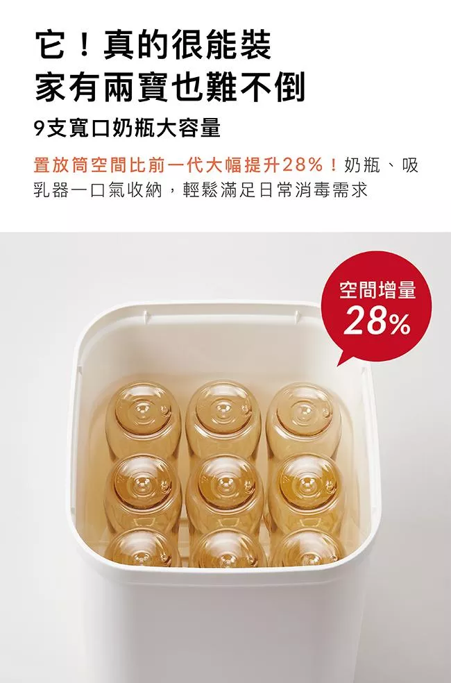 •空間增量28%!可放9支寬口大奶瓶,吸乳器配件一口氣收納。