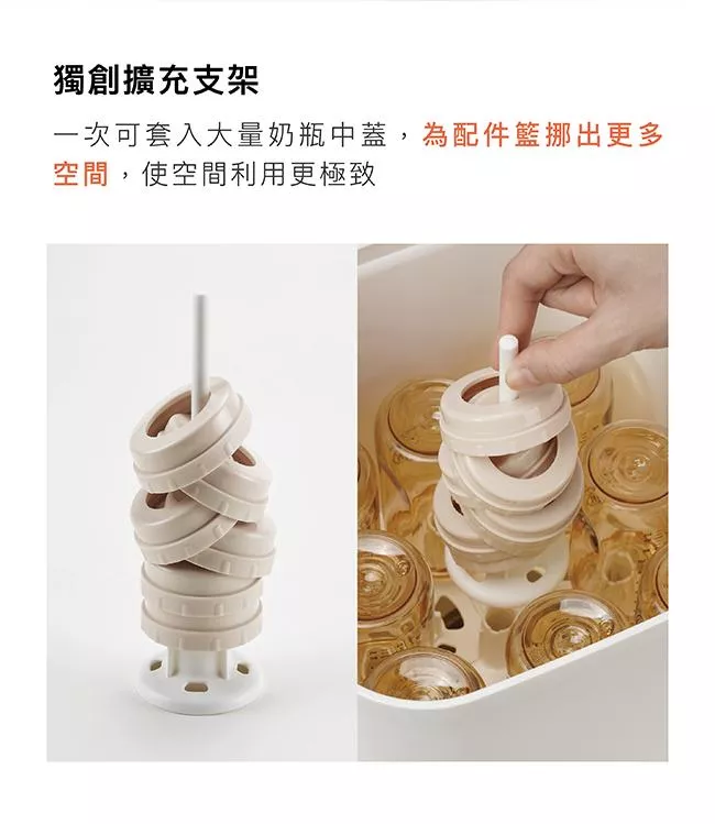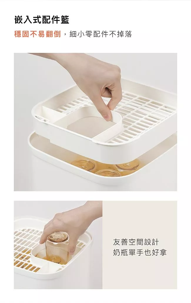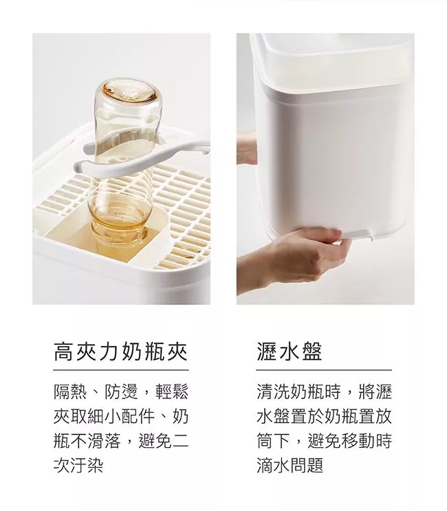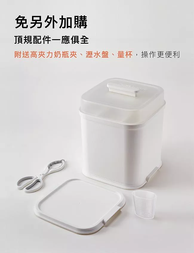•頂規配件一應俱全,附送高夾力奶瓶夾、瀝水盤、量杯,操作更便利。