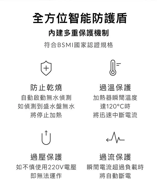 •符合BSMI國家認證規格,防止乾燒、過溫保護、過壓保護、過流保護。