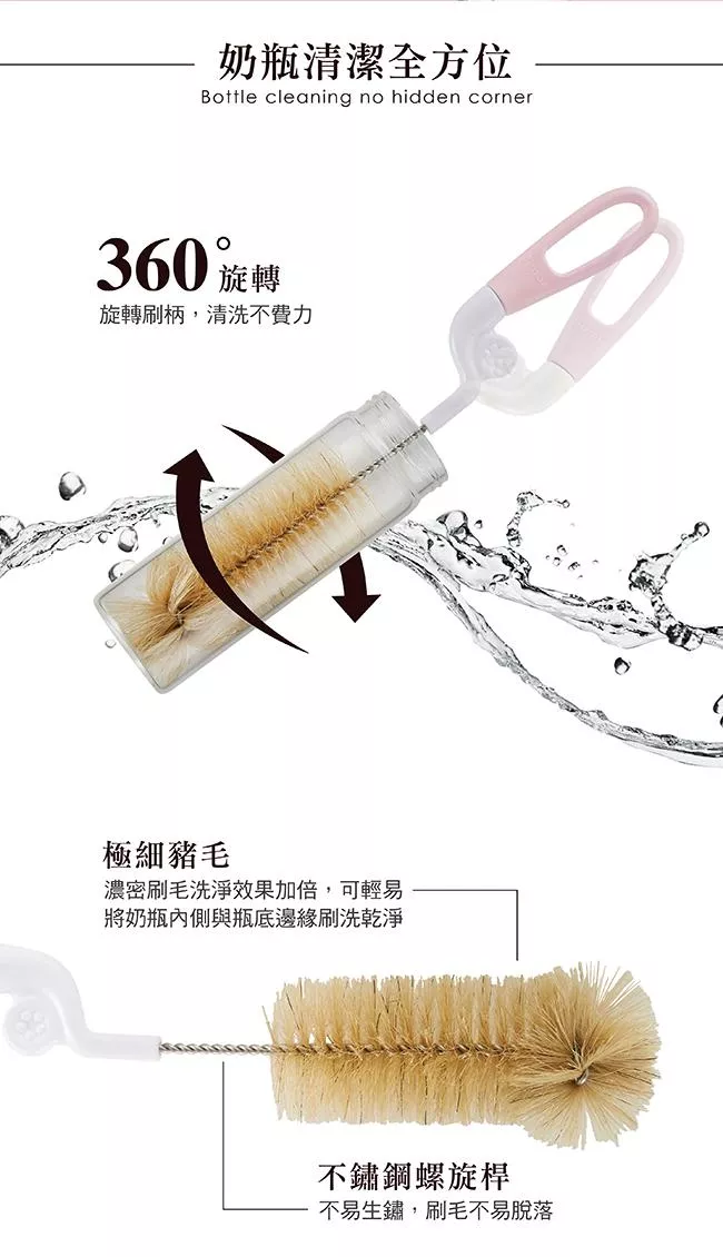 1.豬毛柔軟不刮傷奶瓶,可輕易將奶瓶內側與瓶底邊緣刷洗乾淨,洗淨效果加倍。