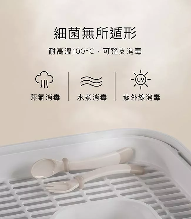 9. 一體成型,可蒸氣、水煮、紫外線消毒,清潔消毒無死角。