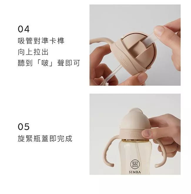 依說明書裁剪吸管長度,依正確方向放入墊圈,組裝吸管配件,將吸管對準卡榫向上拉出,聽到啵聲即可,旋緊瓶蓋即完成。