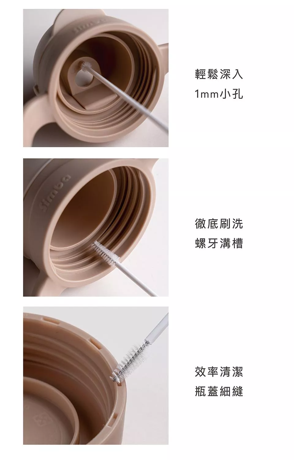 1.使用前務必沾濕刷毛再穿入吸管或細小配件,上下左右來回刷洗。