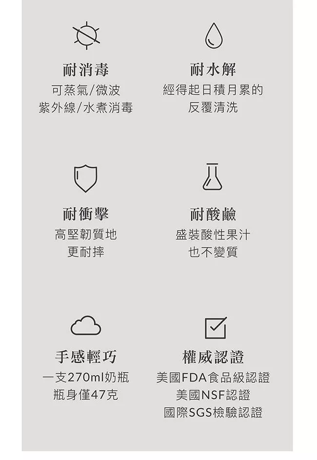 7.業界唯一每批奶瓶瓶身經國際權威SGS嚴格檢驗,不含雙酚A&S、塑化劑。