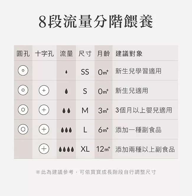 使用本產品前應確實清洗及消毒,並依寶寶吸吮能力、副食品濃稠度...等實際使用狀況,替換適合的孔徑與尺寸。