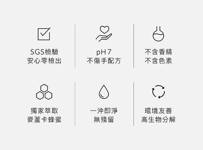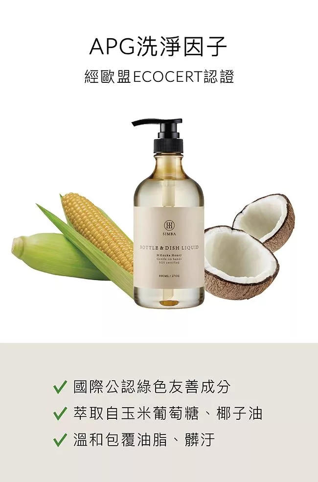 全成分:水、月桂醯胺丙基二甲基甜菜鹼、α-磺化-ω-烴基聚環氧乙烷-C10-16-烷基醚鈉鹽、D-葡萄派喃糖癸基辛基葡醣苷寡聚物、N-[3-(二甲胺基)丙基]十二醯胺N-氧化物、丙三醇(甘油)、氯化鈉、肉豆蔻酰胺丙基胺氧化物、2-羥基丙烷-1,2,3-三羧酸、PEG-150季戊四醇四硬脂酸酯、PPG-2羥乙基椰油酰胺、蛋白分解酵素/枯草桿菌蛋白酶、氯己定二葡糖酸鹽、2-甲基異噻唑啉-3-酮、蜂蜜萃取(麥蘆卡蜂蜜)