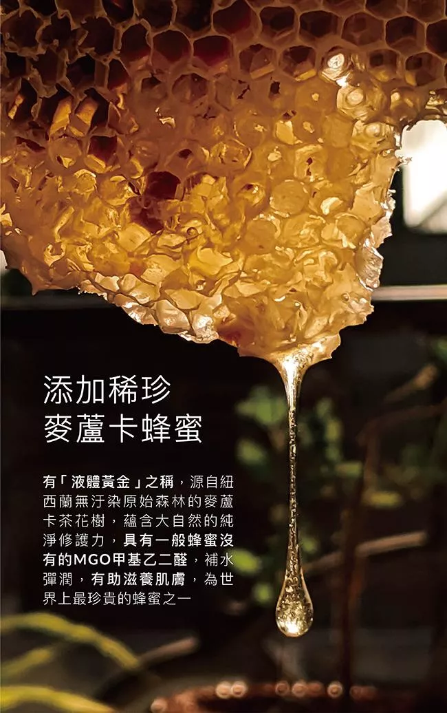 2. 添加稀珍麥蘆卡蜂蜜,具有一般蜂蜜沒有的MGO甲基乙二醛,補水彈潤,有助滋養肌膚。