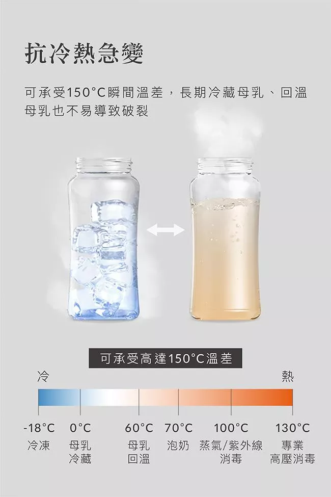 •奶瓶:硼矽酸玻璃(-40℃~ 600℃)