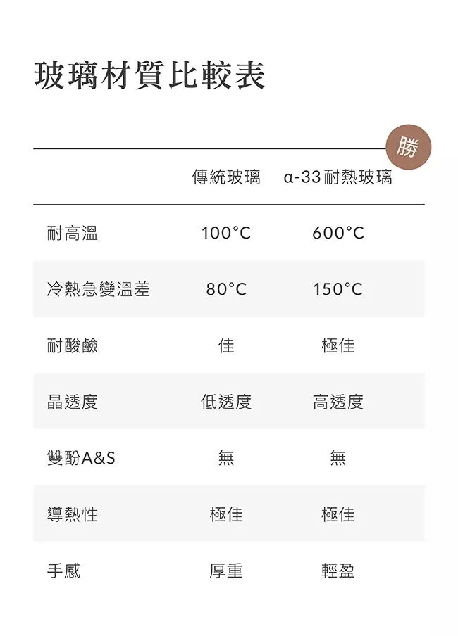 6.嚴選頂級α-33耐熱玻璃,不含雙酚A&S、塑化劑,耐高溫600˚C。