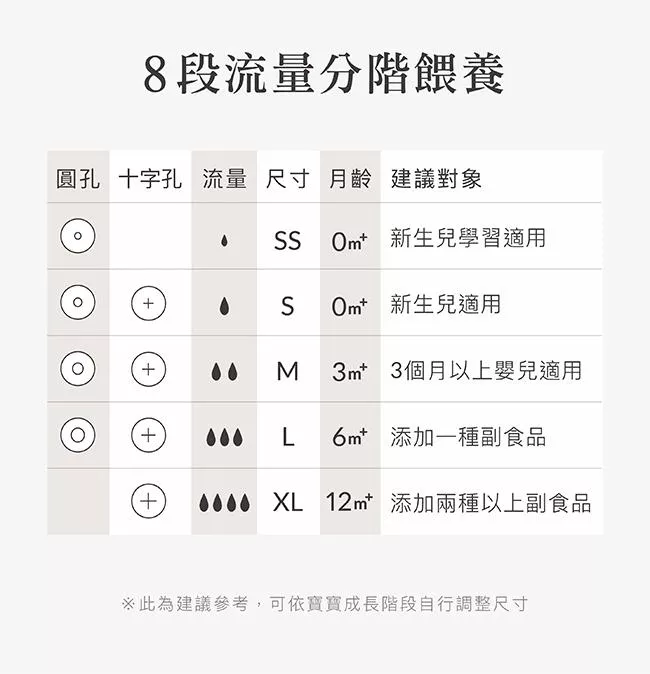 5.支援新生兒成長階段,容量、奶嘴尺寸、儲乳配件齊全。