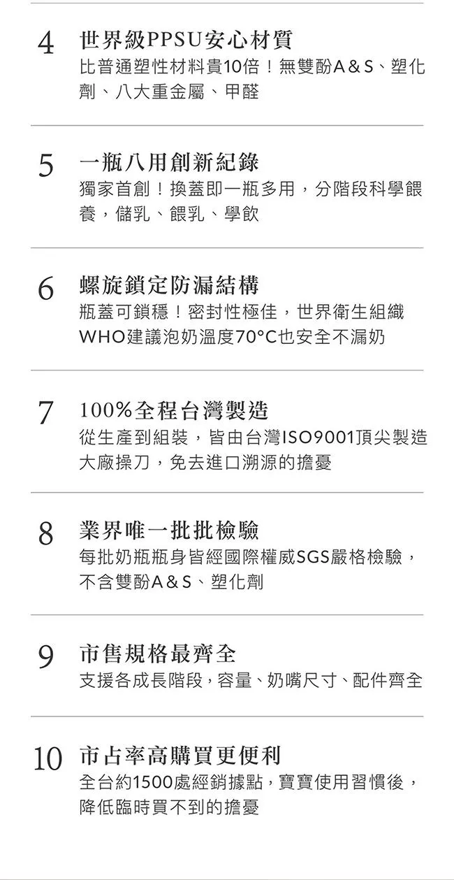 7.業界唯一每批奶瓶瓶身經國際權威SGS嚴格檢驗,不含雙酚A&S、塑化劑。