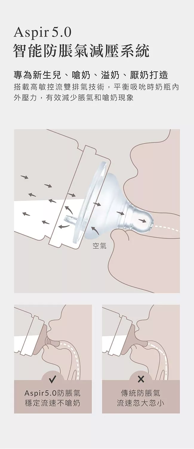 2.Aspir5.0智能防脹氣減壓系統,防嗆奶、防溢奶、防脹氣。