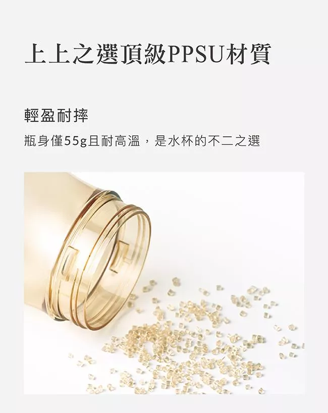 1.瓶身嚴選頂級PPSU材質,輕盈耐摔且耐高溫。