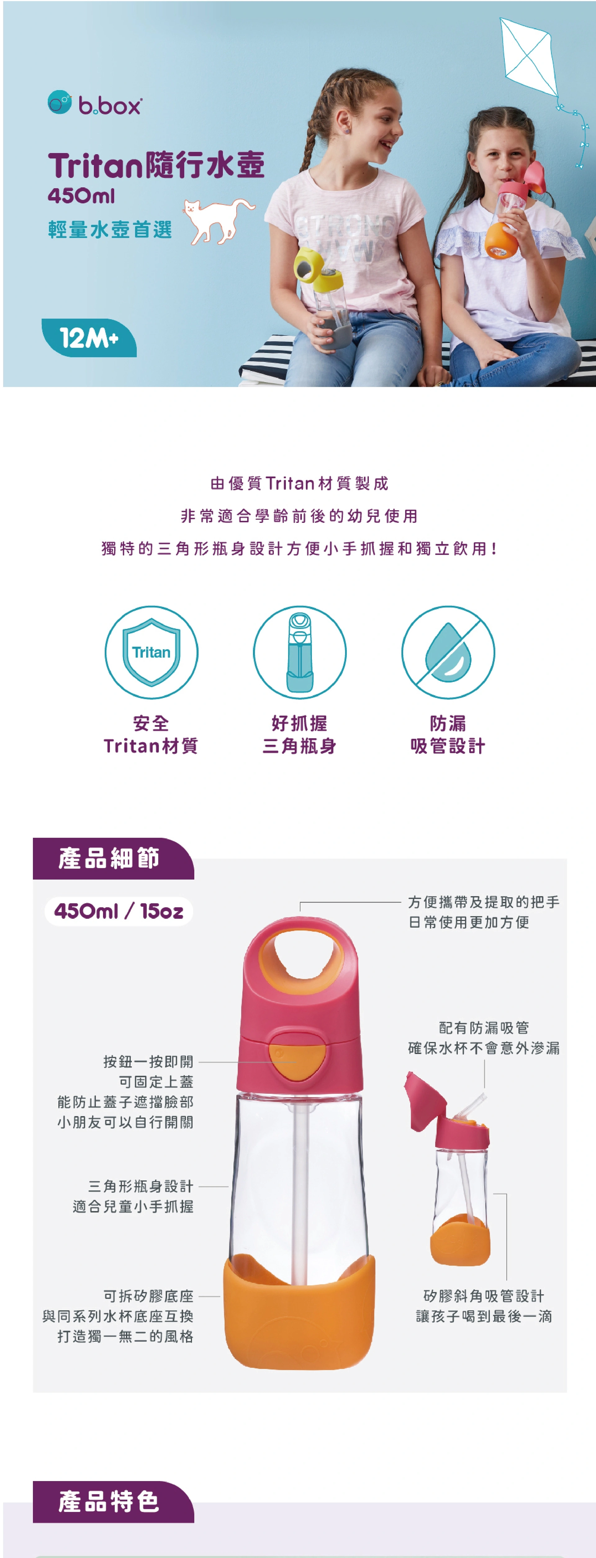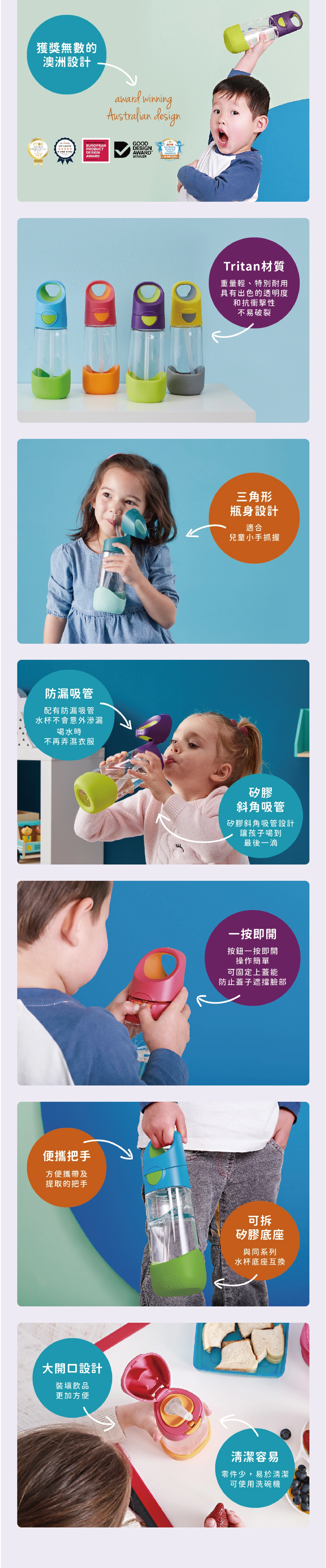 ・獨特人體工學三角形瓶身設計完美貼合兒童雙手握持的方式