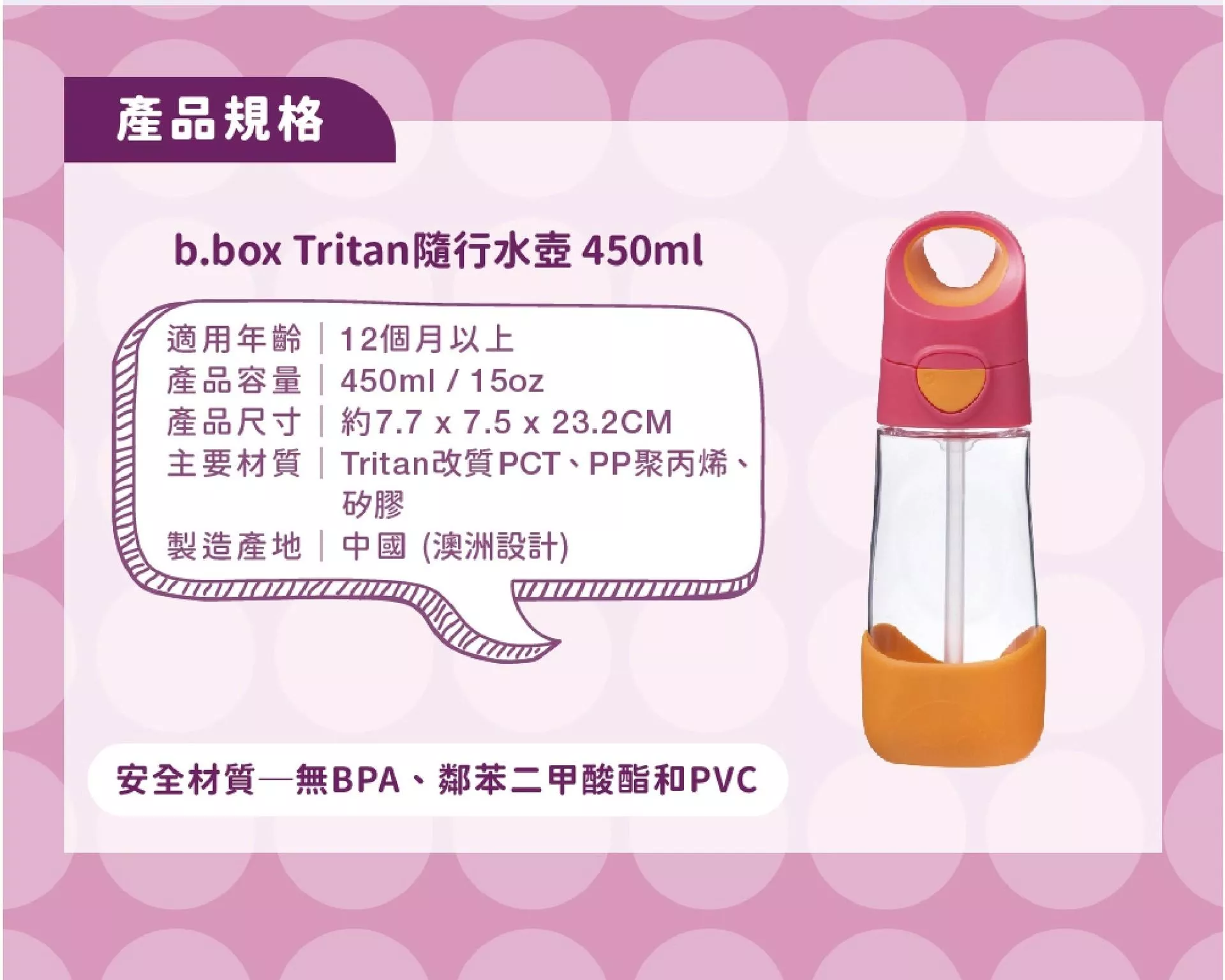 材質/耐熱:PP聚丙烯、矽膠、tritan改質PCT,耐熱90°C