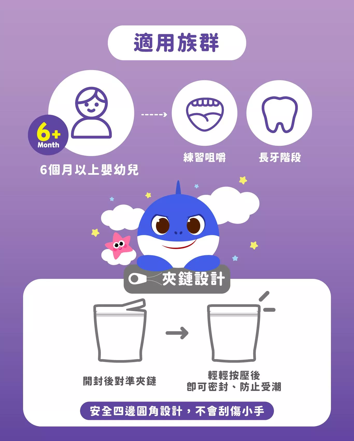 •適合六個月以上嬰幼兒(開始練習咀嚼、長牙階段)。