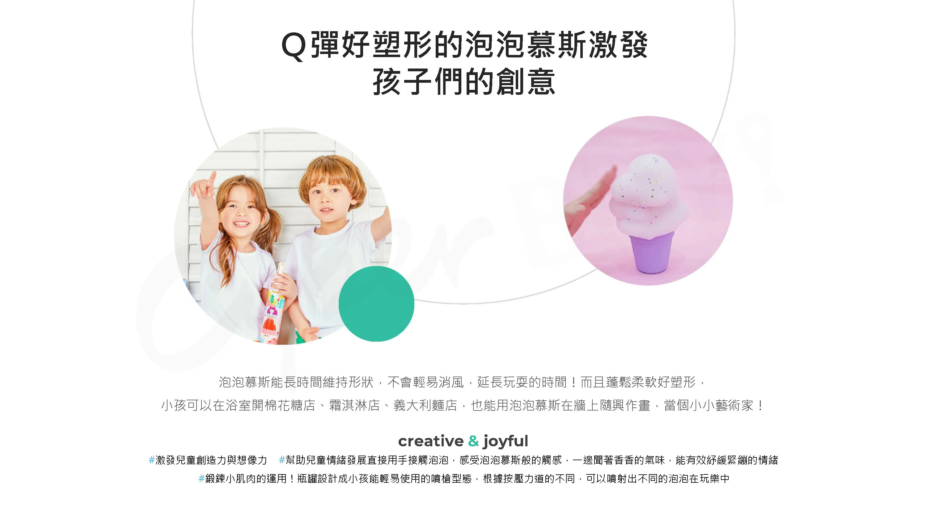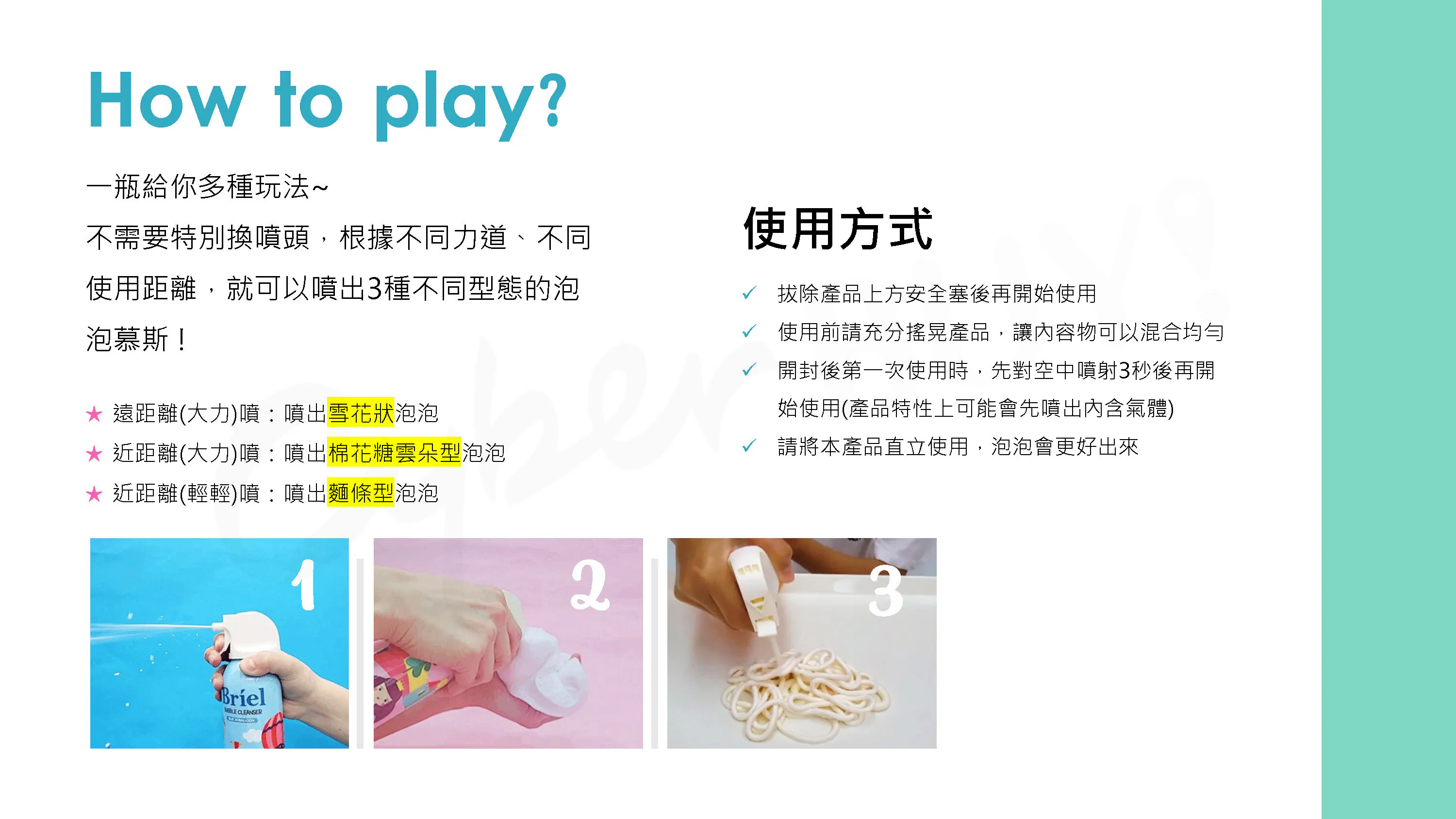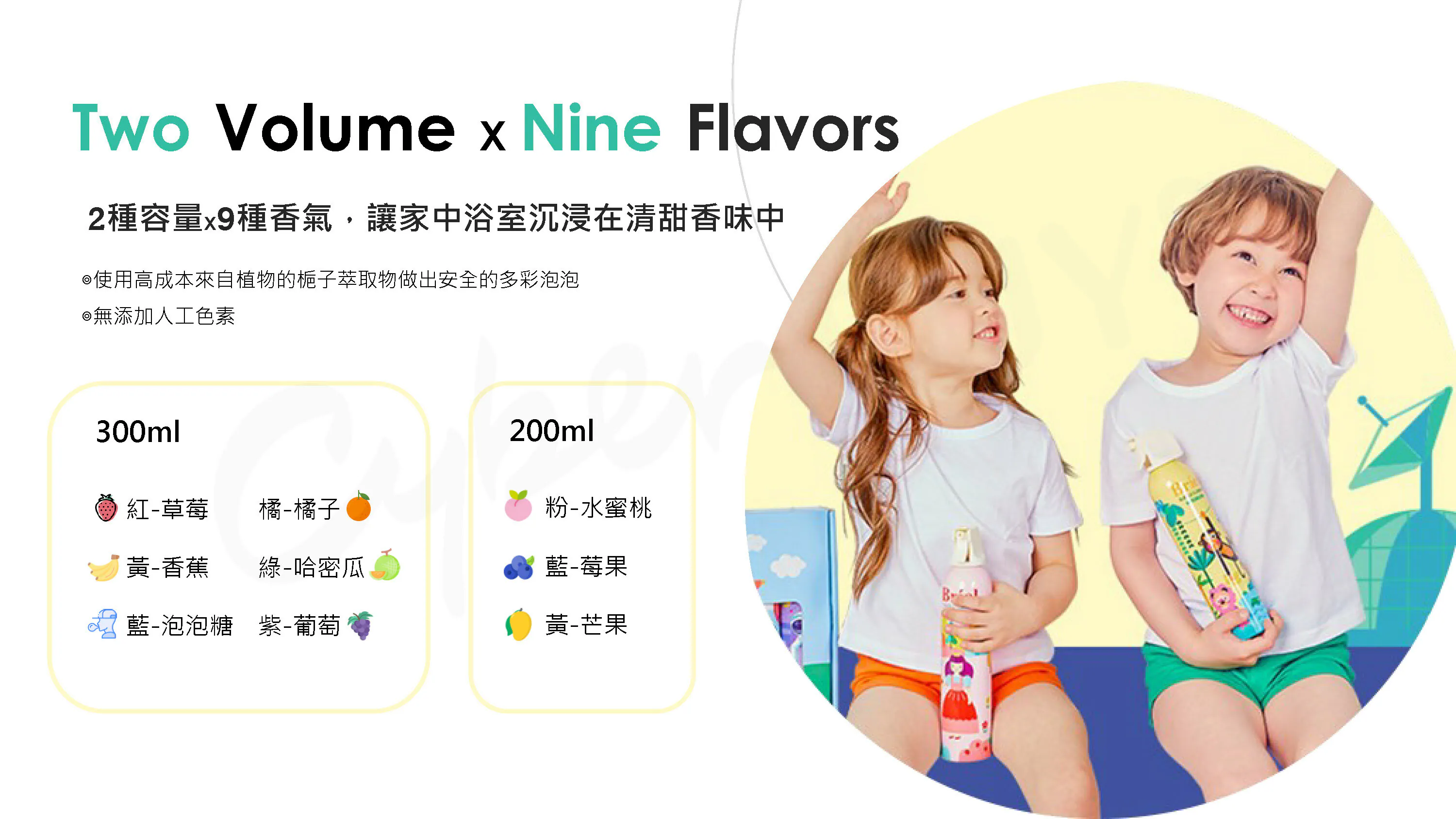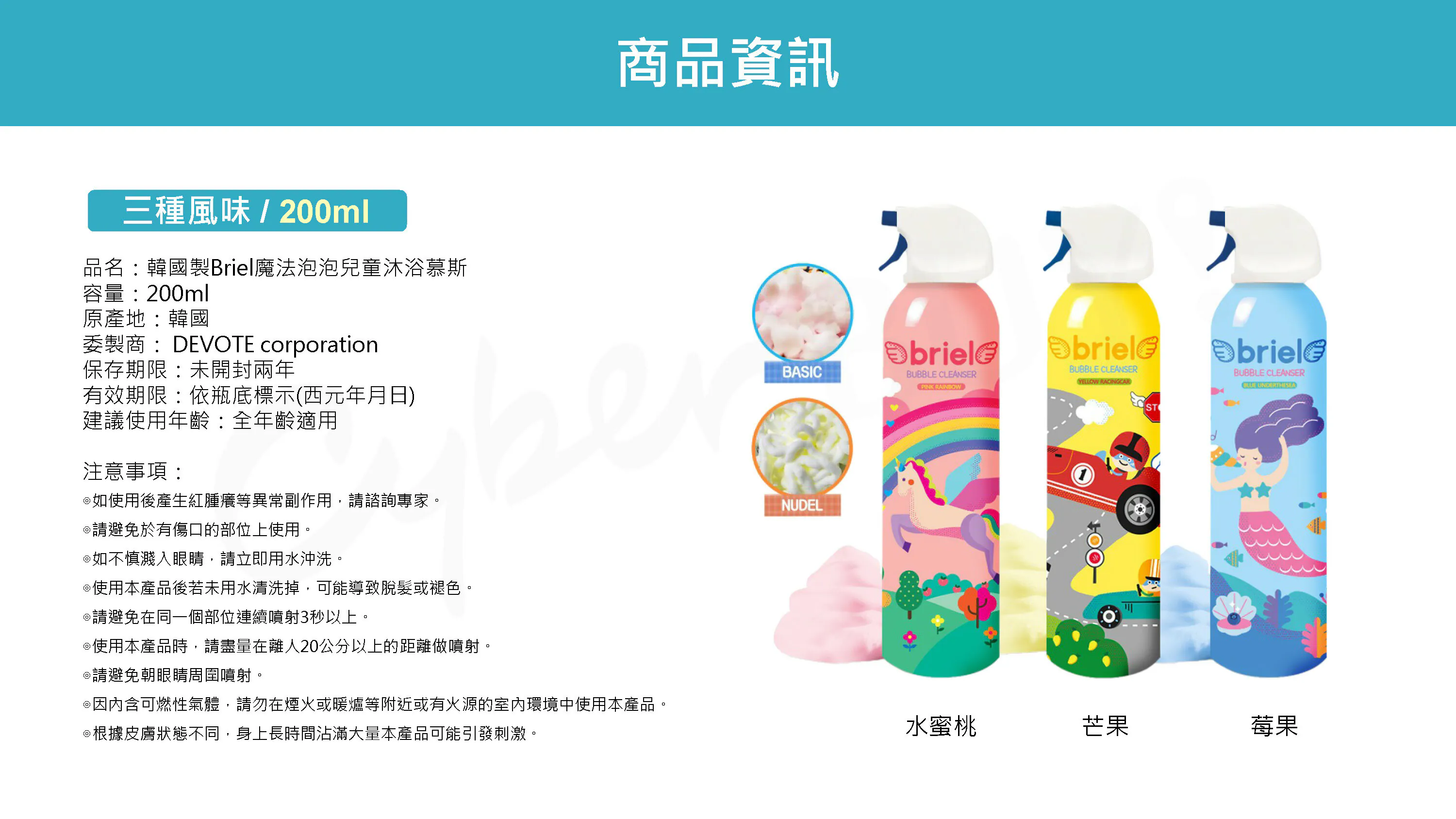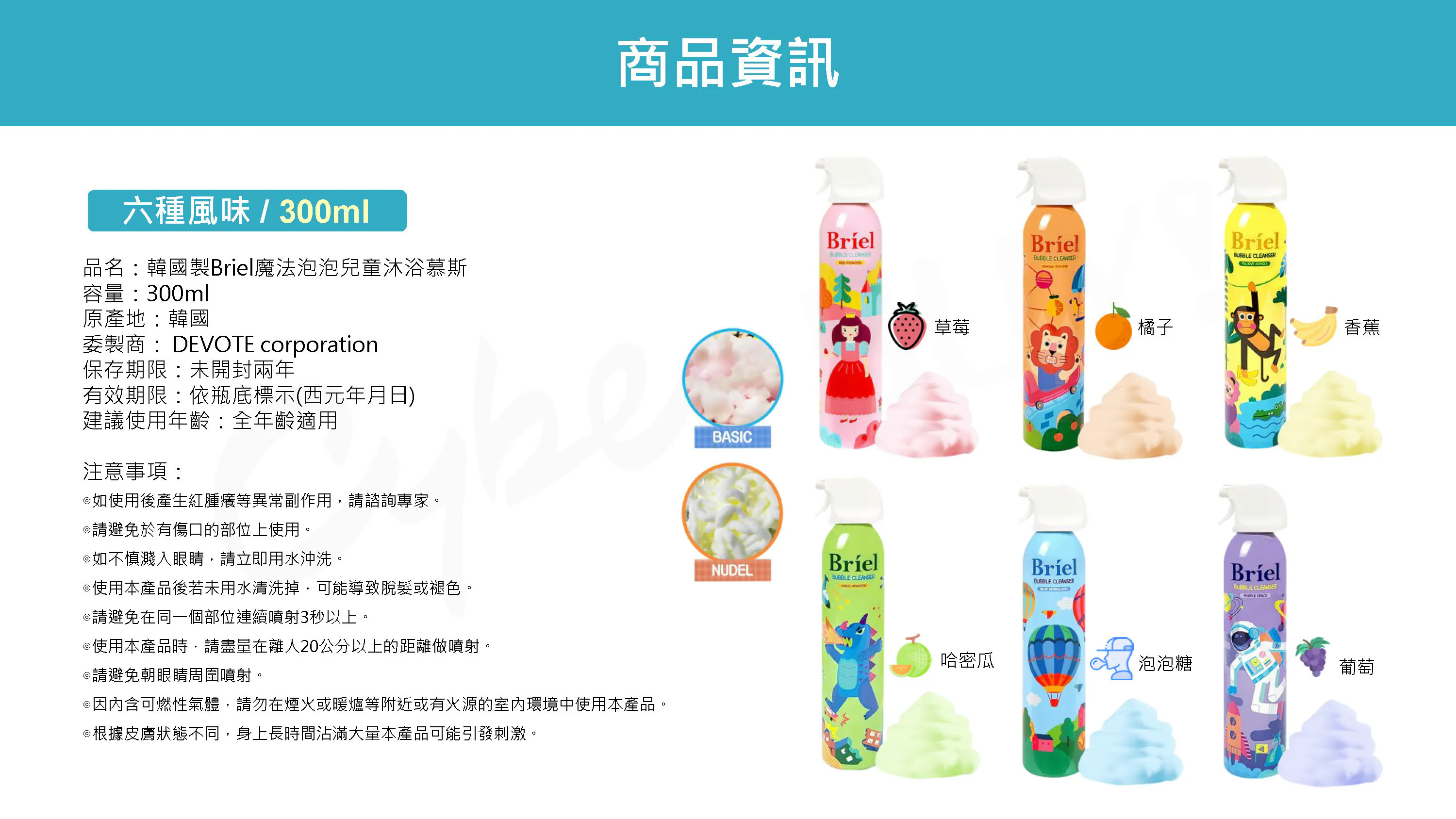 Briel魔法泡泡兒童沐浴慕斯-2種容量✕9種香氛(顏色)選擇•一瓶多種玩法,依據不同力道、距離可噴出不同型態泡沫•蓬鬆柔軟的泡泡慕斯,還能長時間維持形狀•無添加人工色素,只要一瓶就可從頭洗到腳!