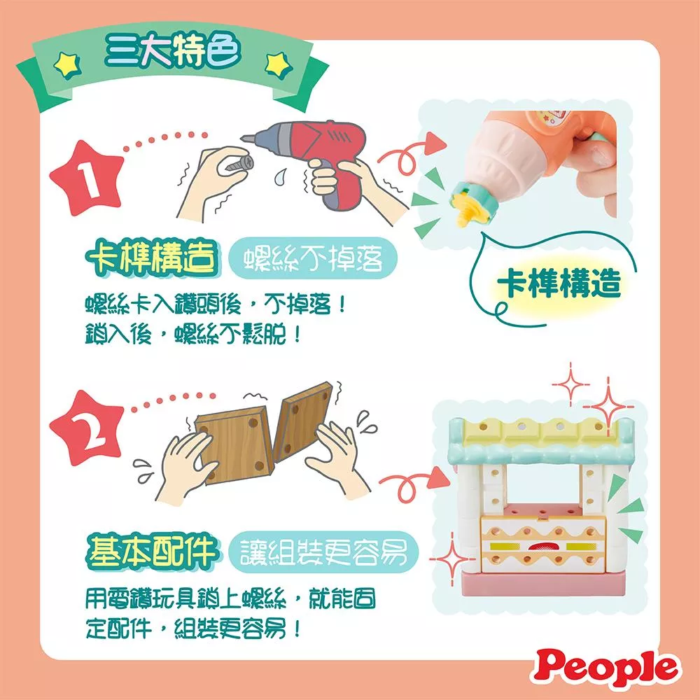 2.「基本配件」,讓組裝更容易:用電鑽玩具鎖上螺絲,就能固定配件,組裝更容易!