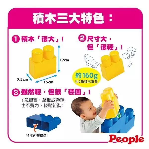 1.積木「很大」:不像小積木手指操作較不易,大尺寸大大滿足1歲孩子的組裝樂趣!