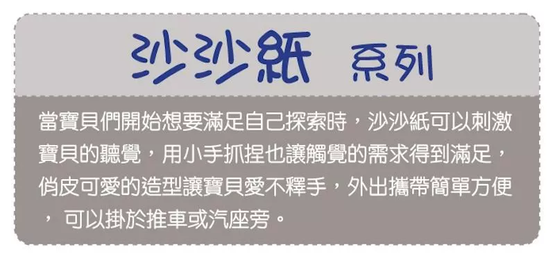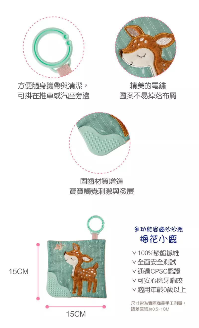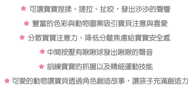 • 靈活的拉環,可連接嬰兒車和嬰兒床,隨身好攜帶。• 內有寶貝最愛的沙沙紙,可有效安撫寶寶的情緒。• 不含BPA,PVC和鄰苯二甲酸鹽等有害物質。• 轉角固齒器的設計,讓口腔期的寶寶可以安心恣意的啃咬,滿足寶寶的需求。