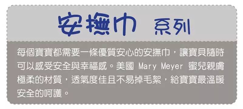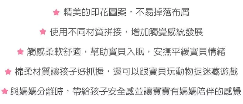 • 寶貝最愛打結的角落• 優雅配色、精緻刺繡的細節• 安全柔軟布料適合孩子抓握• 纖細柔軟不傷害寶寶柔嫩肌膚• 刺激發育,有效的安撫寶寶