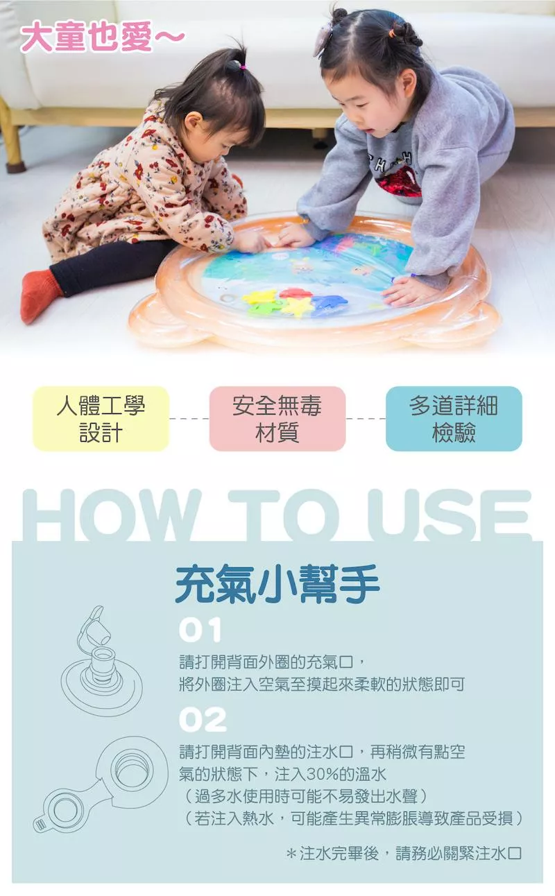 讓寶寶趴著玩!!增強頸、肩、背肌力,促進全身運動技能充氣加水後,內置色彩繽紛造型海綿會隨著施壓處飄動,吸引寶寶視覺注意,發展手眼協調充氣加水後,水墊可緩衝寶寶突然趴下所承受的重力