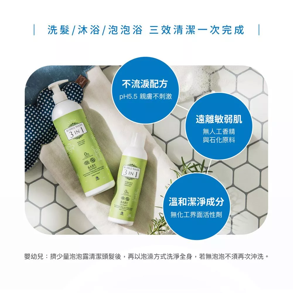▪ 沐浴、洗髮、泡泡浴三合一,溫和潔淨,潤澤寶寶稚嫩的肌膚,甜蜜香氛,沐浴親子親暱時光。