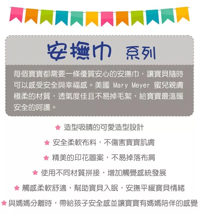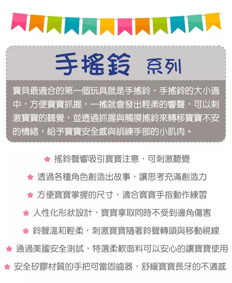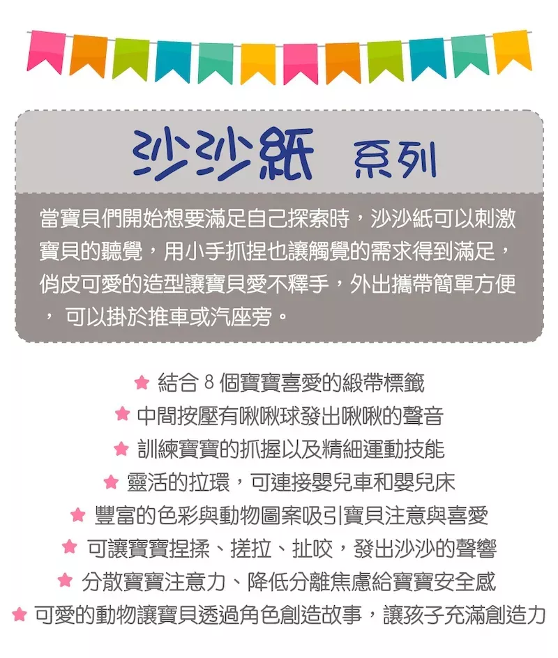 • 完美適合小手的尺寸易抓握,讓寶寶輕鬆訓練小手的肌肉。• 安全柔軟布料,纖細柔軟不傷害寶寶柔嫩肌膚。• 商品聲響設計,可刺激寶寶聽覺,亦適合寶寶手指動作練習