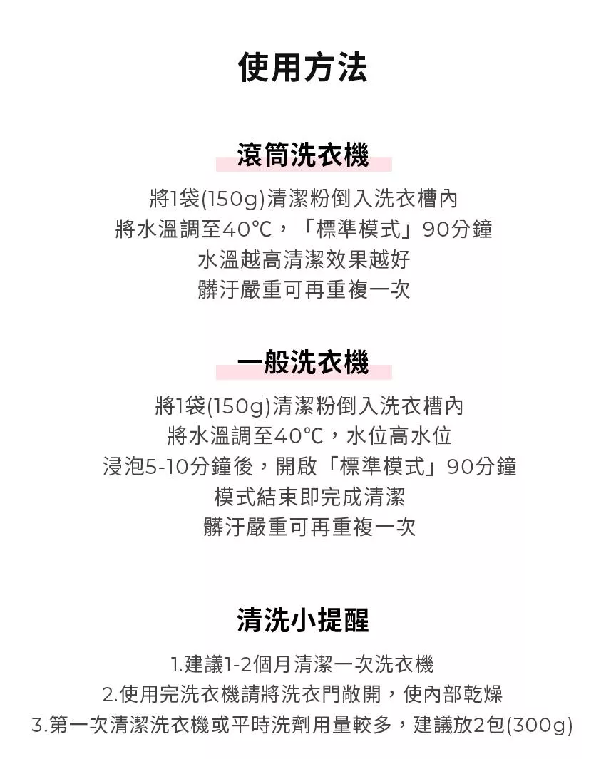 - 3.第一次清潔洗衣機或平時洗劑用量較多,建議放2包(300g)