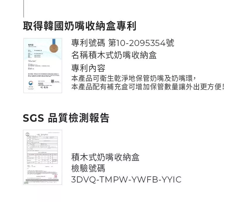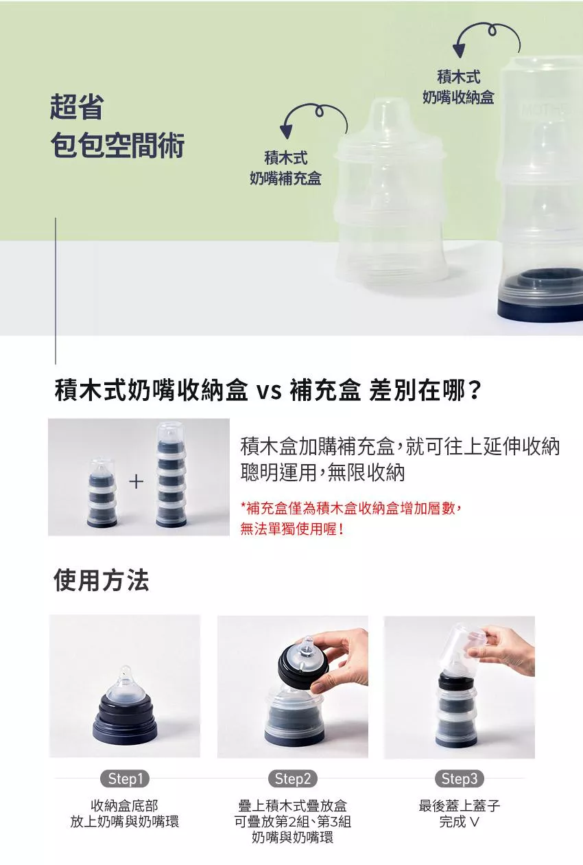- A:積木式奶嘴收納盒可收納3組奶嘴與奶嘴環,若是覺得3組不夠,可再購買積木式奶嘴收納補充盒(可收納2組奶嘴與奶嘴環),積木式奶嘴收納補充盒無法單獨使用,需先購買積木式奶嘴收納盒