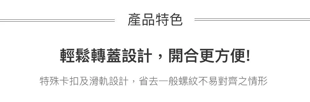 •輕鬆轉蓋設計,開合更方便!特殊卡扣及滑軌設計,省去一般螺紋不易對齊之情形