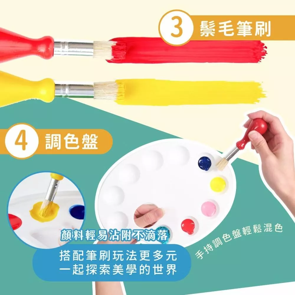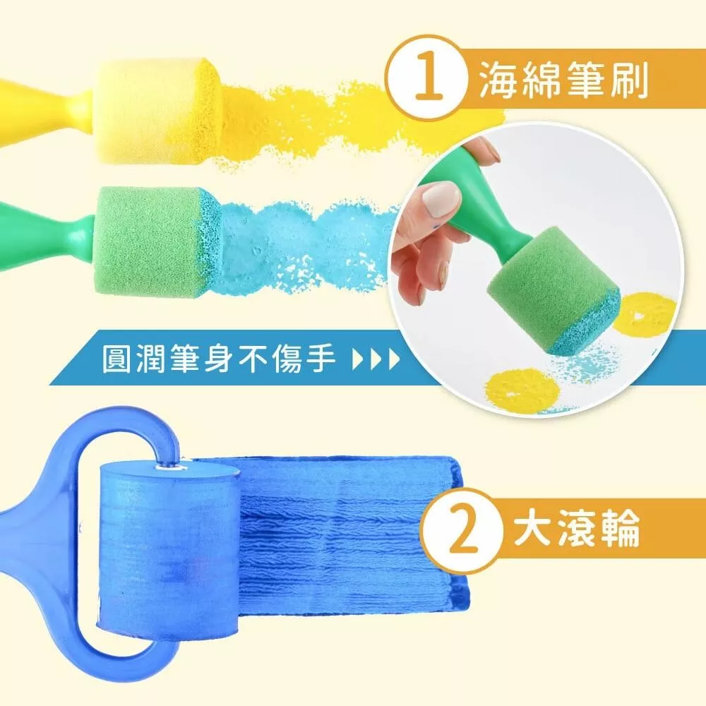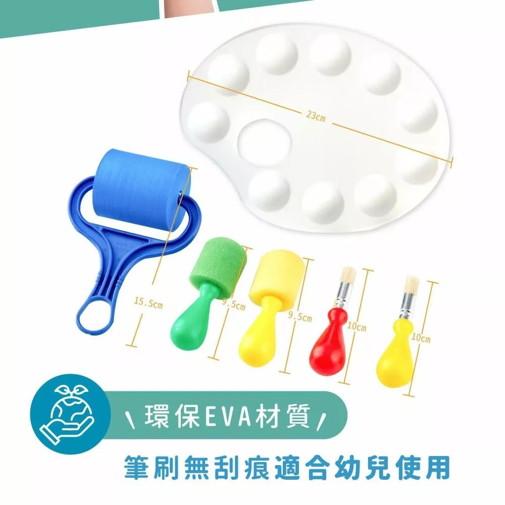 · 1個調色盤、1個大海綿刷、2個圓柄刷、2個圓筆刷