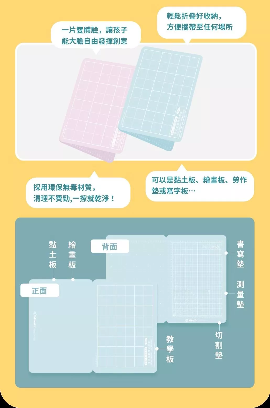 使用方法:可正面塗鴉、玩黏土、教學,背面可切割、書寫、手作測量使用