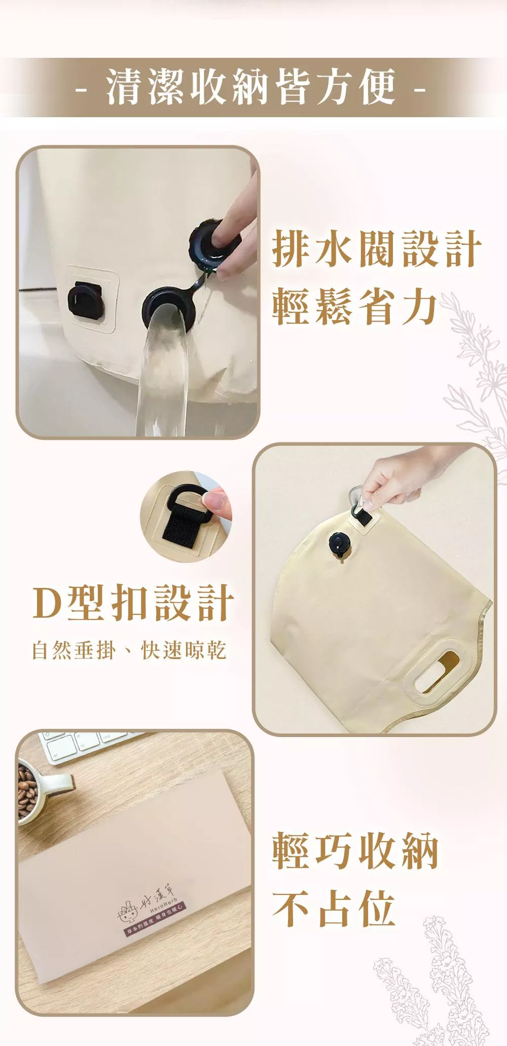 D型環(又稱U型扣)設計於外觀上,洩水口放水及使用完畢後,可將D型環掛置牆面掛鈎,並將足浴袋口朝下晾乾即可