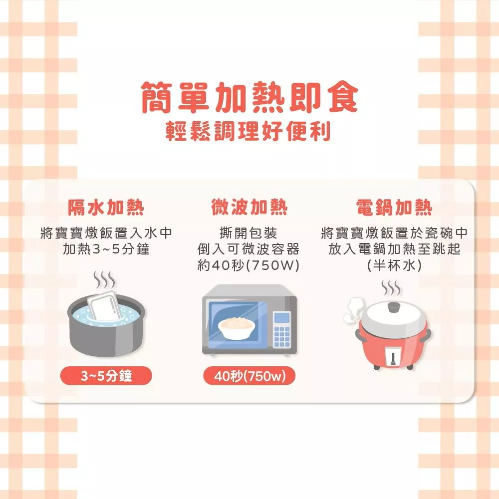 - 常溫保存, 隔水加熱3-5分鐘,方便即食,爸媽零煩惱