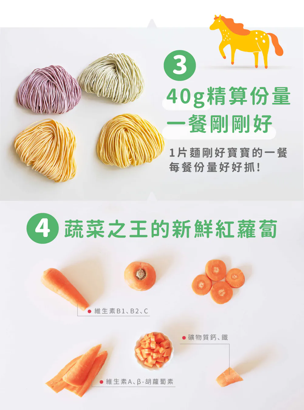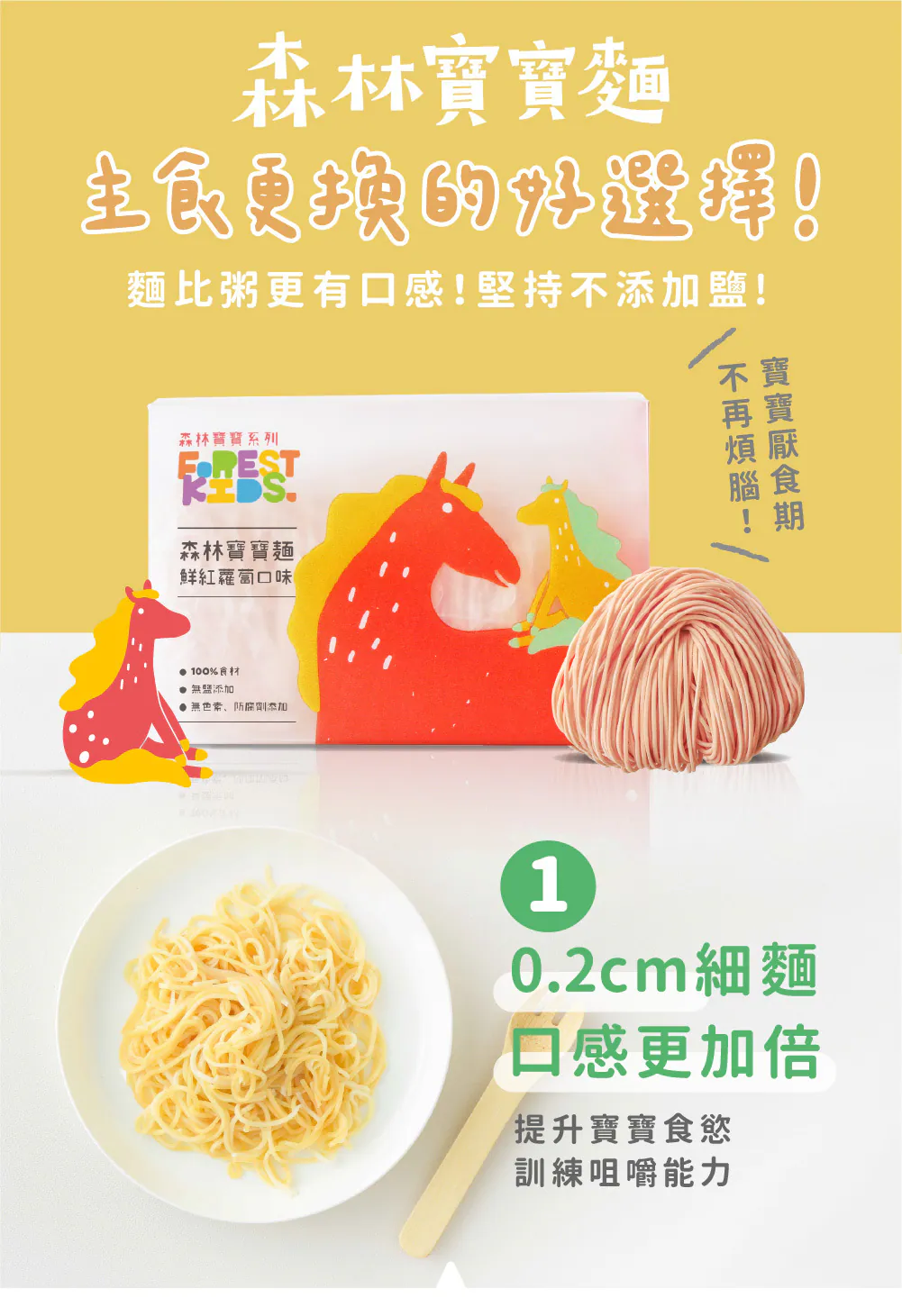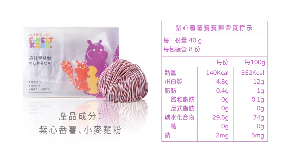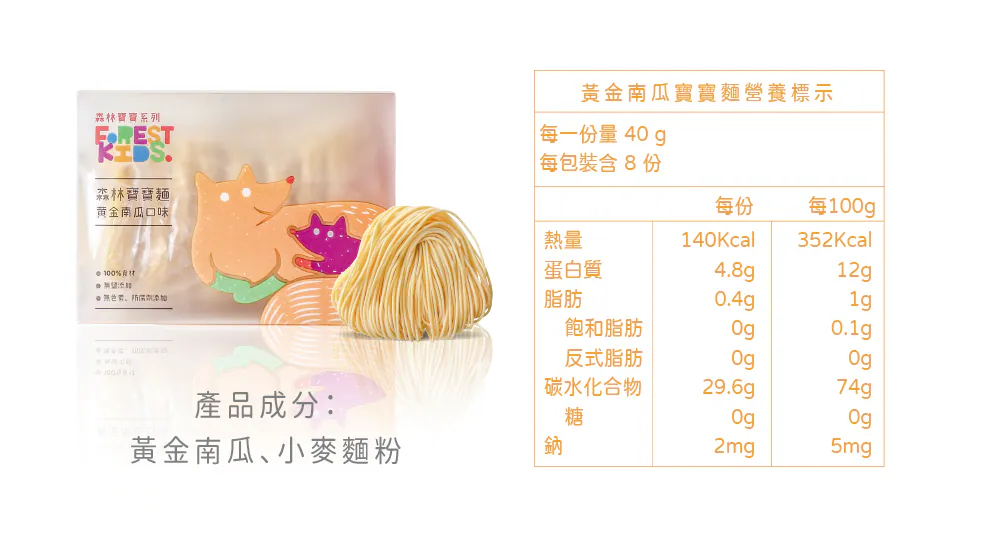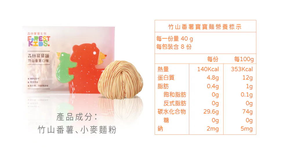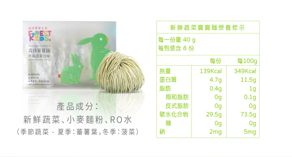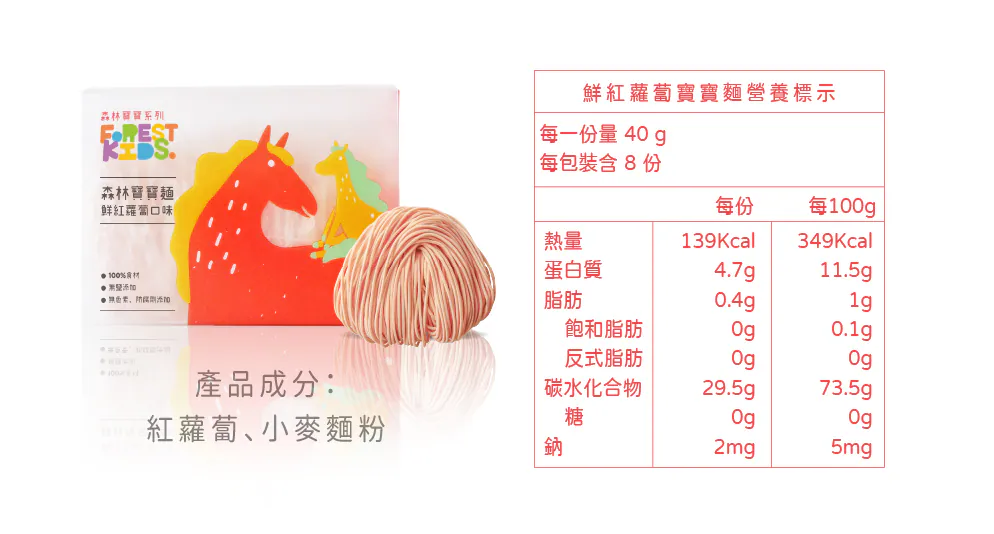寶寶每日所需的鈉含量必須低於200毫克,而寶寶麵的鈉含量來自食材本身約只有2毫克且完全無鹽呦!