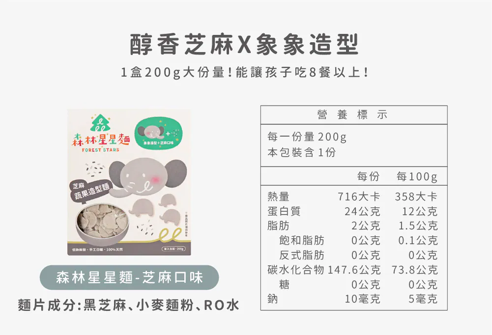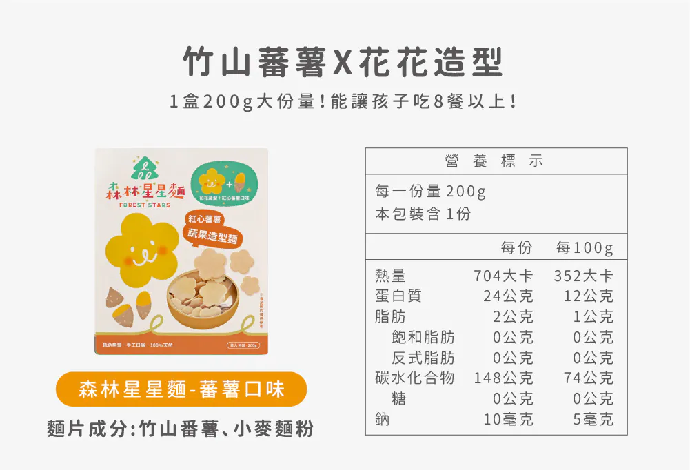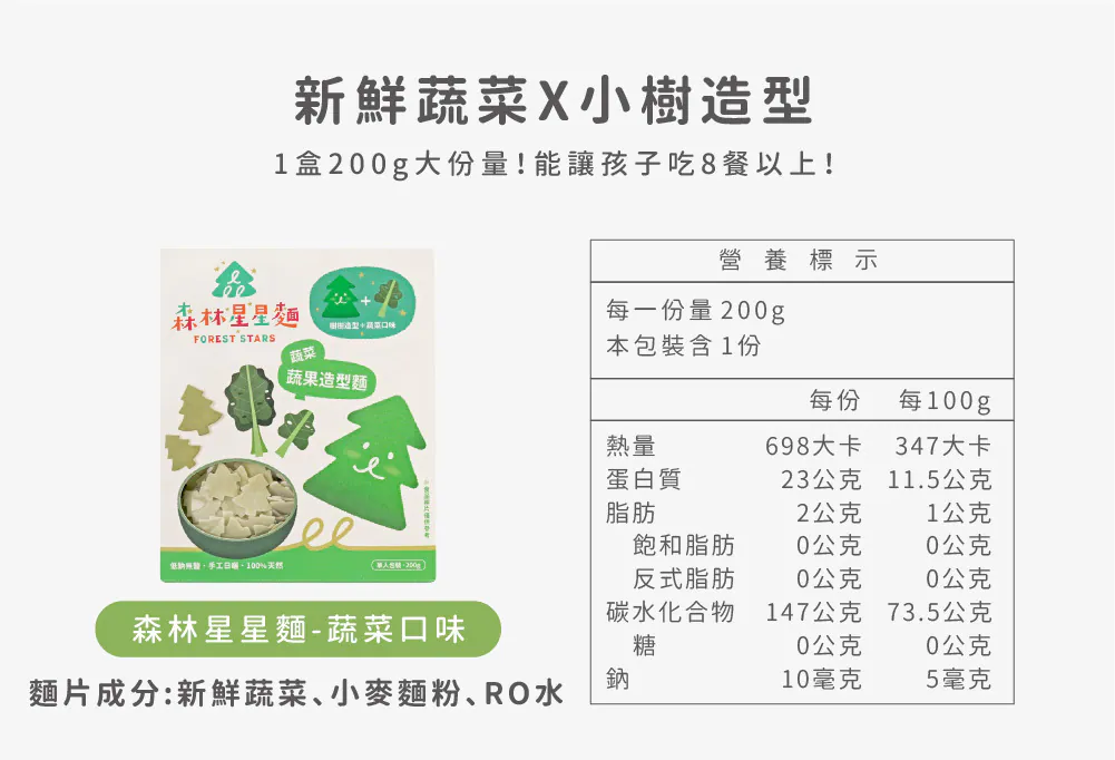寶寶每日所需的鈉含量必須低於200毫克,而星星麵的鈉含量來自食材本身約只有2毫克且完全無鹽呦!