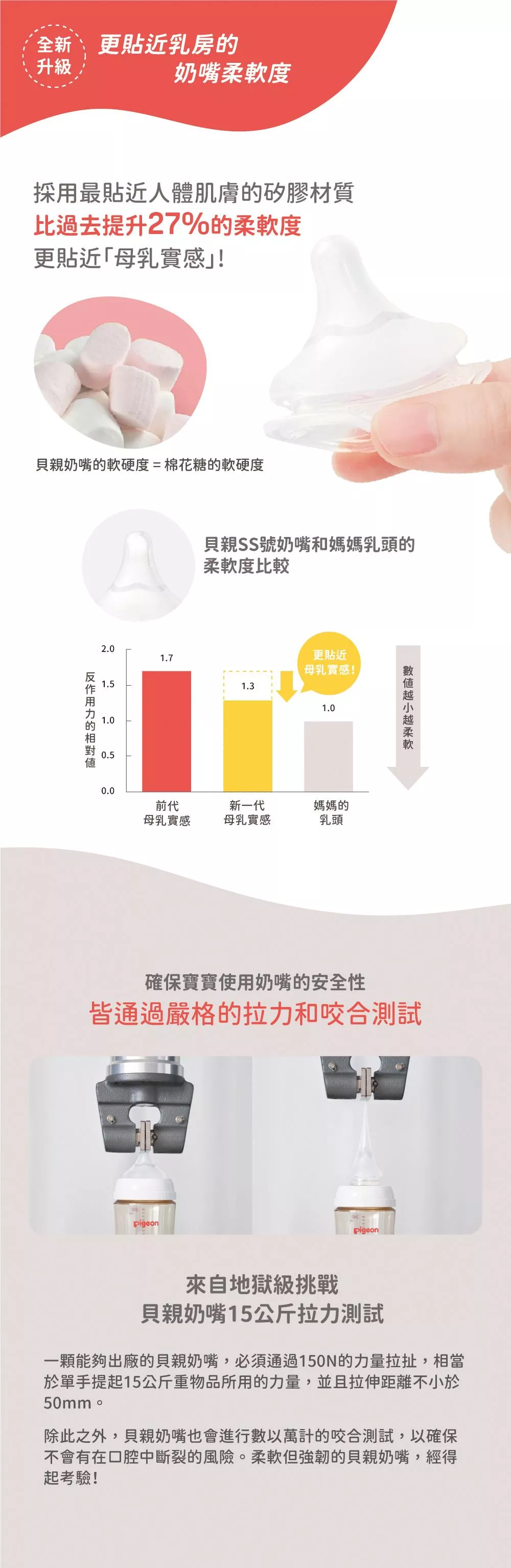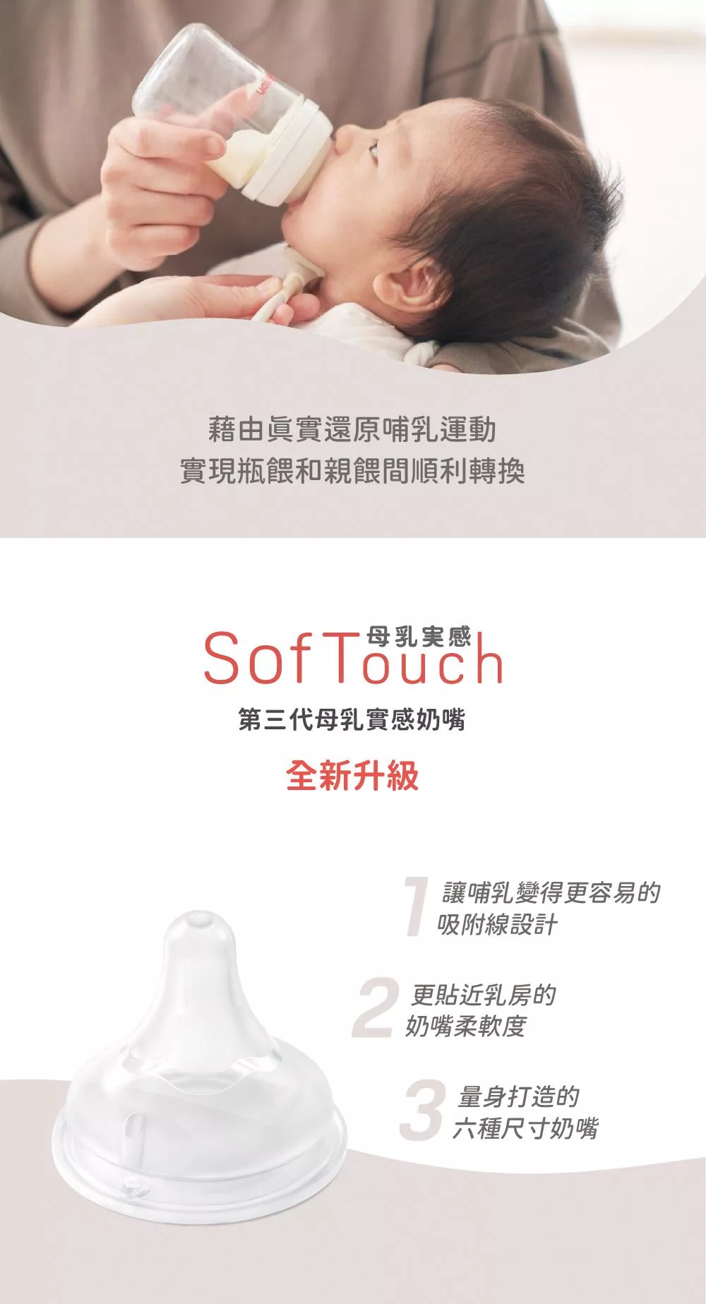 2.棉花糖般的柔軟:全新開發的11度奶嘴專用矽膠,接近人體肌膚柔軟度,更貼近母乳實感,讓寶寶舌頭可以順暢運動。