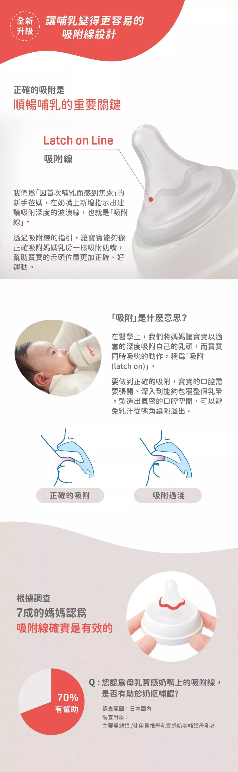 1.新增「吸附線」:新增建議寶寶吸附深度指示波浪線,協助寶寶正確吸附,即使是新手爸媽哺乳也無需焦慮。