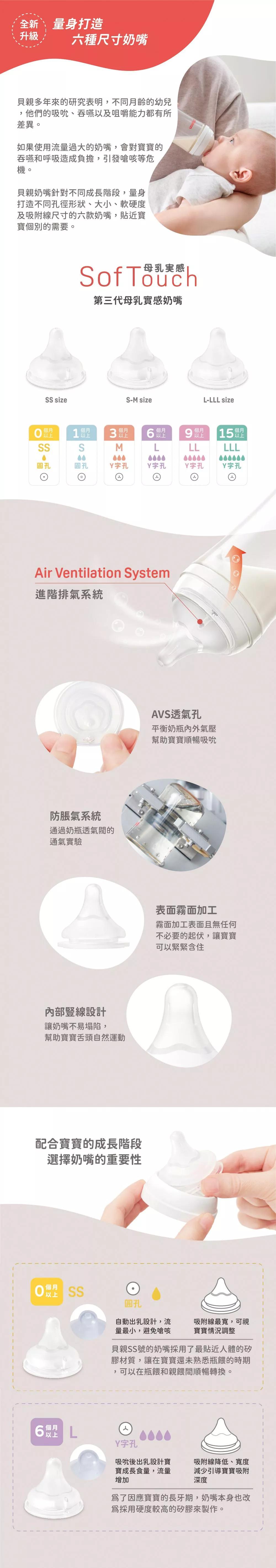 3.量身打造六種尺寸奶嘴:針對不同成長階段,我們量身打造了不同孔徑形狀、大小、軟硬度及吸附線尺寸的六款奶嘴,貼近寶寶個別的需要。