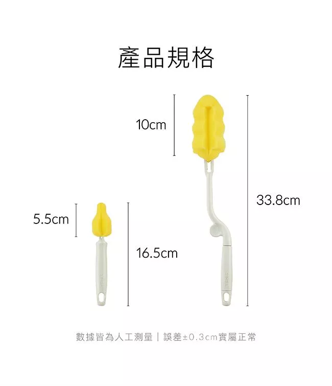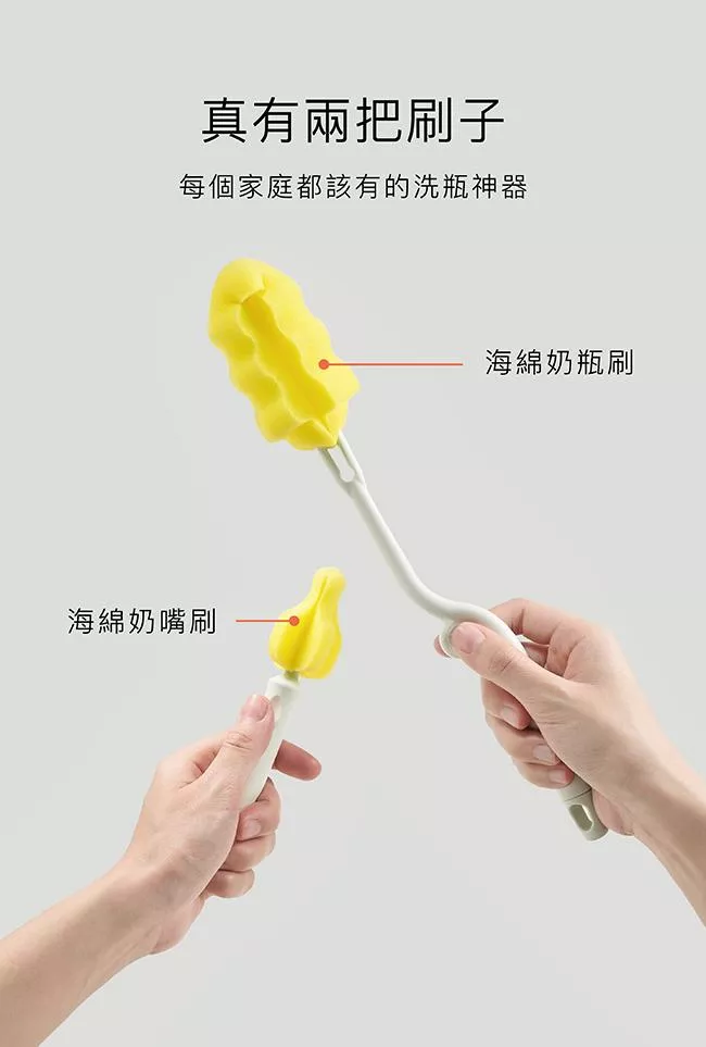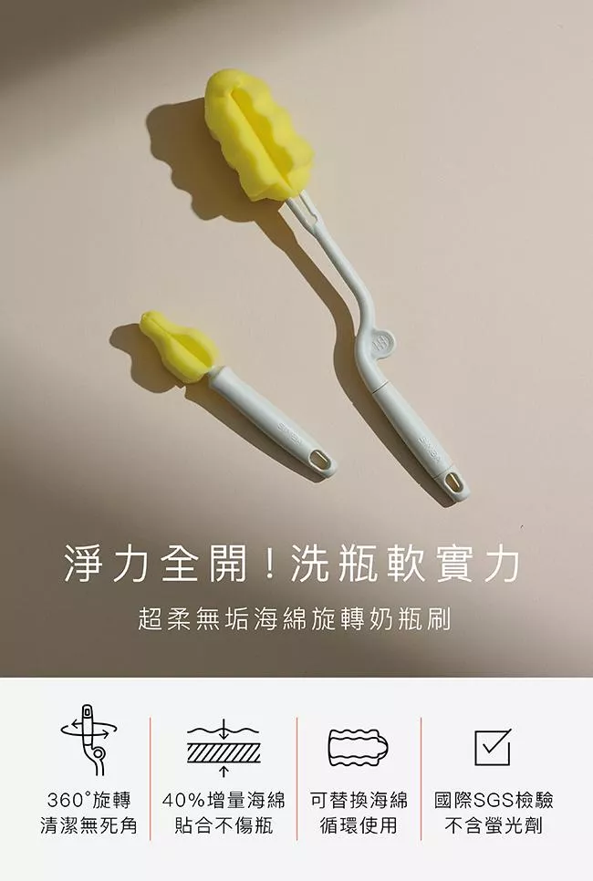 可搭配奶瓶清潔劑使用,深入瓶身360°旋轉刷洗,洗淨後懸掛於通風處晾乾。