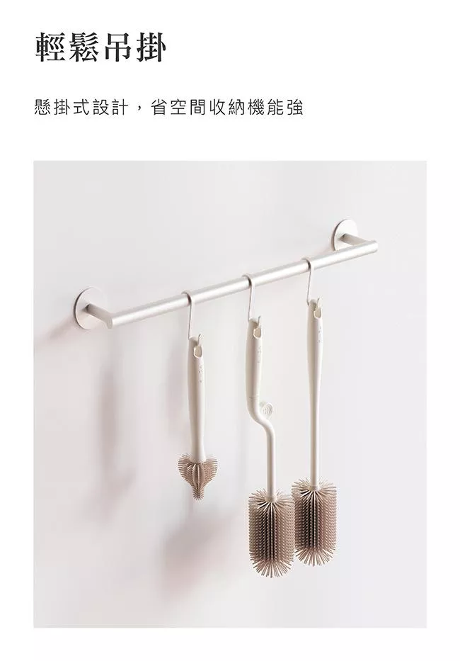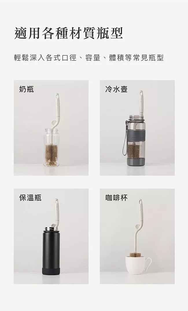 可搭配奶瓶清潔劑使用,深入瓶身360°旋轉刷洗,洗淨後懸掛於通風處晾乾。