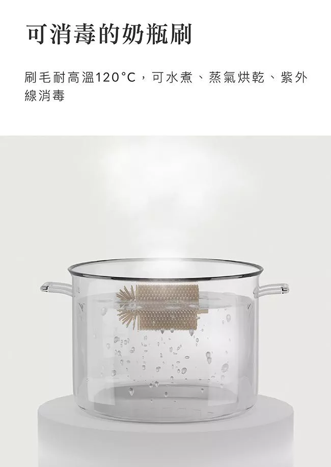 8. 刷毛耐高溫120˚C,可水煮、蒸氣烘乾、紫外線消毒。
