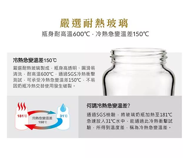 1.瓶身嚴選耐熱玻璃製成,耐高溫600℃,冷熱急變溫差150℃。